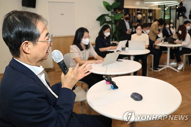 (서울=연합뉴스) 김승두 기자 = 한덕수 국무총리가 23일 정부서울청사에서 출입기자들과 만나 백브리핑을 하고 있다. 2022.9.23