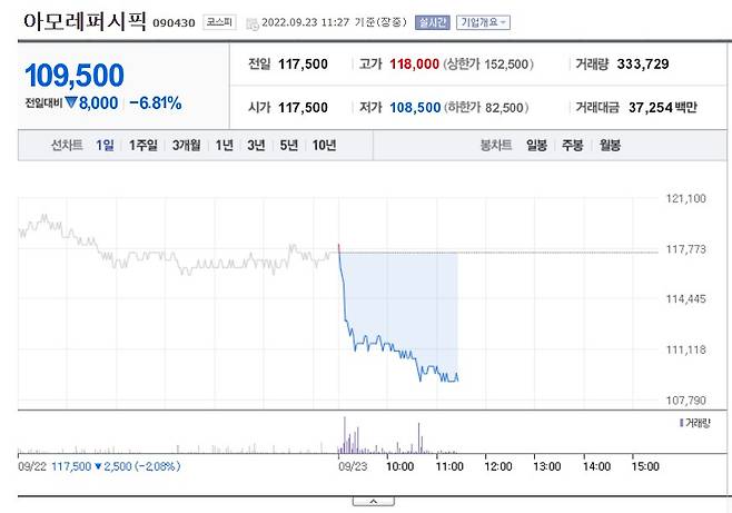 23일 오전 아모레퍼시픽은 6.38% 하락한 11만원에 거래 중이다. 장중 10만8500원까지 밀리며 52주 신저가를 기록했다. 코스맥스(-6.86%), 한국콜마(-2.57%), 토니모리(-5.93%) 등 다른 화장품주도 대부분 약세를 보이고 있다.