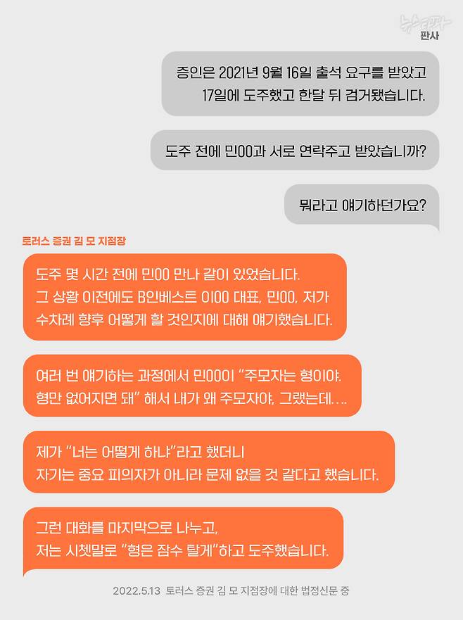 이미 검찰 조사를 받은 민 이사가, 자신은 문제가 없을 것 같다며 토러스증권 김 지점장에게만 도피를 권유했다는 얘기다. 민 이사는 2021년 9월 초 B인베스트 압수수색 당시에도 자신이 사용하던 전화기 뿐만 아니라 과거에 사용했던 전화기까지 스스로 임의제출했다. (5.6 공판, B인베스트 이00 대표에 대한 판사의 증인 신문 중)