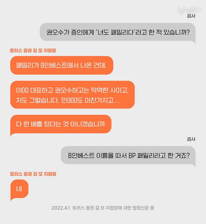 미국으로 달아난 민 이사는 B인베스트 이 대표의 처남이다. B인베스트는 앞에서 언급했듯 도이치모터스 주가조작 2차 작전의 거점 중 하나였다. 이들과 함께 2차 작전의 또 다른 주역인 토러스증권 김 모 지점장, 그리고 도이치모터스 권오수 회장은 자신들을 ‘패밀리’라고 했다고 한다.