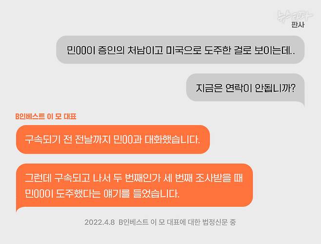 그런데 김건희 파일과 관련된 핵심 증인인 B인베스트 이사 민 씨가 미국으로 도주해 현재 1년 가까이 도피 생활을 하고 있다는 사실이 재판 과정에서 드러났다.