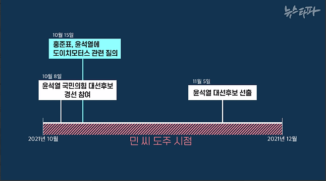 검찰 수사에 이렇게 자신감을 내비쳤던 민 이사가 도주한 것은 2021년 10월에서 12월 사이다. 앞서 소개한 증언에 따르면 민 씨가 도주한 것은 B인베스트 이 대표가 구속된 2021년 10월 8일 이후고, 검찰이 민 이사를 ‘기소중지’라고 표현한 검찰 수사 결과 발표, 즉 12월 3일 이전이기 때문이다. 이 시기는 윤석열 대통령이 국민의힘 경선 후보로 출마하면서 김건희 여사의 도이치모터스 주가조작 연루 의혹이 다시 수면 위로 떠오르던 때다.