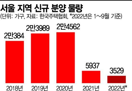 서울 지역 신규 분양이 감소세로 돌아선 것은 지난해부터다. 2018년 2만384가구, 2019년 2만3989가구, 2020년 2만4562가구 등 꾸준히 2만 가구 이상 공급되던 서울 신규 분양은 지난해 2021년 5937가구로 줄어들더니 올해는 이날까지 3529가구에 머무르고 있다. 업계에서는 분양을 미루는 현장이 계속 늘고 있어 올해는 4000가구 분양도 어려울 것으로 예상한다.