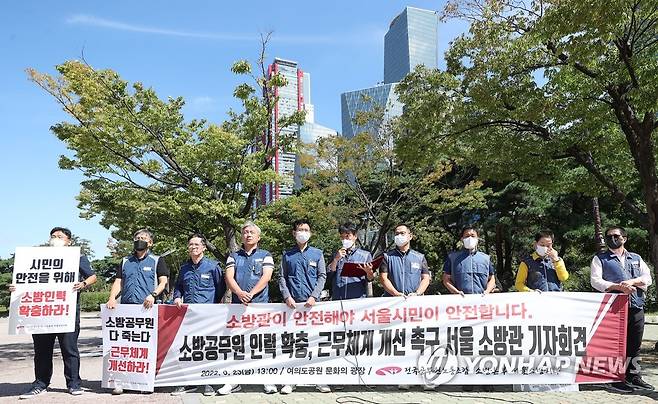 (서울=연합뉴스) 신현우 기자 = 23일 오후 서울 여의도공원 문화의마당에서 전국공무원노동조합 소방본부 서울소방지부 조합원들이 기자회견을 열고 소방 공무원 인력 확충과 근무체계 개선을 촉구하고 있다. 2022.9.23