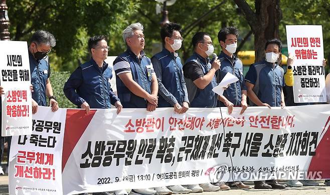 (서울=연합뉴스) 신현우 기자 = 23일 오후 서울 여의도공원 문화의마당에서 전국공무원노동조합 소방본부 서울소방지부 조합원들이 기자회견을 열고 소방 공무원 인력 확충과 근무체계 개선을 촉구하고 있다. 2022.9.23