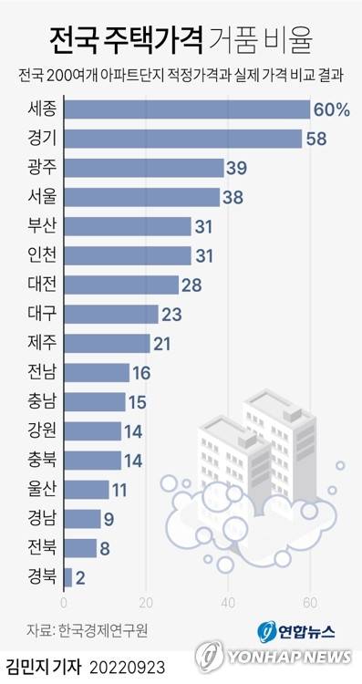 (서울=연합뉴스) 김민지 기자 = 전국경제인연합회(전경련) 산하 한국경제연구원(한경연)은 23일 발표한 '주택가격 거품 여부 논란 및 평가'를 통해 전국 200여개 아파트단지의 적정가격과 실제 가격을 비교한 결과 수도권 주택의 가격거품이 평균 35%나 됐다고 강조했다.