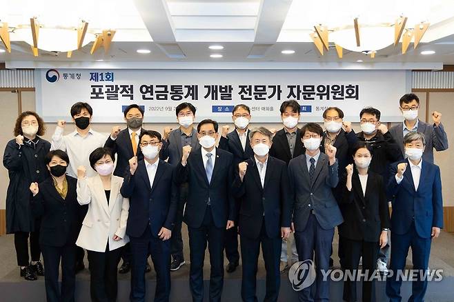 (서울=연합뉴스) 한훈 통계청장(앞줄 왼쪽 네 번째)이 23일 서울 중구 한국프레스센터에서 열린 '제1회 포괄적 연금통계 개발 전문가 자문회의'에서 참석자들과 기념 촬영하고 있다. 2022.9.23 [통계청 제공. 재판매 및 DB 금지]