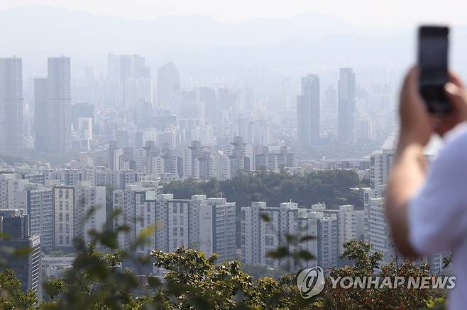 (서울=연합뉴스) 강민지 기자 = 추가 금리 인상 예고와 집값 하락세로 이번주 서울 아파트 매매수급지수는 지난주(80.2)보다 낮은 79.5를 기록하며 지수 80선이 무너졌다. 사진은 23일 서울 남산에서 본 서울 아파트. 2022.9.23