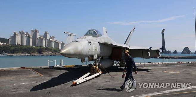(서울=연합뉴스) 23일 부산 23일 부산 남구 해군작전사령부에 입항한 '미해군의 핵추진 항공모함 로널드 레이건함(CVN-76)' 갑판에 EA-18 G Growler가 탑재되어 있다. 2022.9.23 [사진공동취재단]