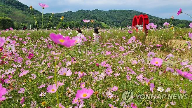 (원주=연합뉴스) 이재현 기자 = 23일 강원 원주시 판부면 서곡리 일원에서 펼쳐지는 2022 원주 용수골 가을꽃 축제장을 찾은 방문객들이 꽃밭을 거닐며 가을을 만끽하고 있다. 2022.9.23