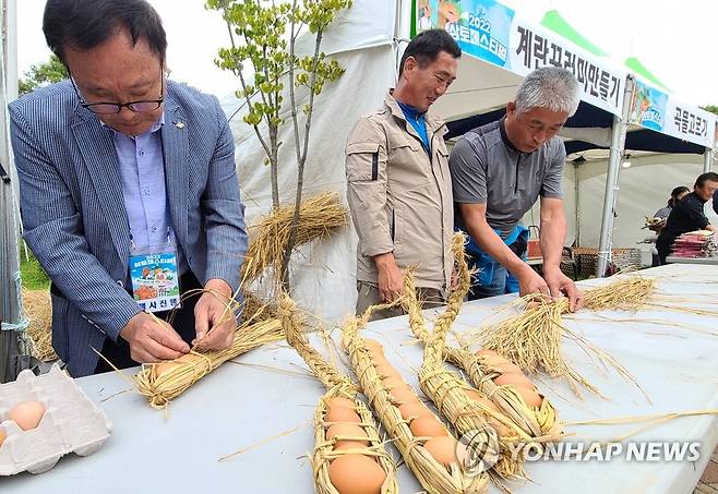 (원주=연합뉴스) 이재현 기자 = 23일 강원 원주시 종합운동장 일원에서 열리는 '2022 원주 삼토페스티벌' 행사장에서 방문객들이 짚으로 계란 꾸러미 만들기 체험을 하고 있다. 2022.9.23