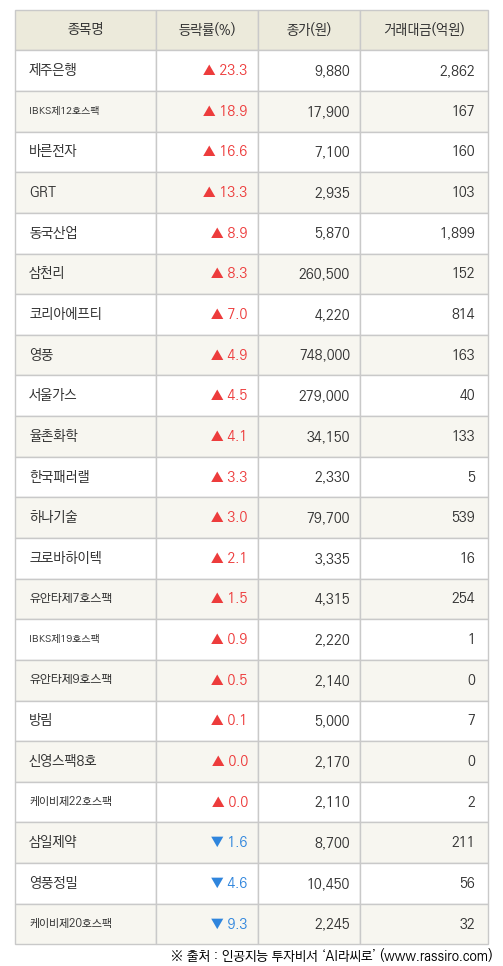 [fnRASSI]제주은행, IBKS제12호스팩 등 22종목 52주 신고가 경신