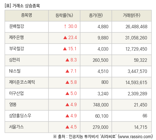 상승한 종목으로 문배철강(008420) 30.0%, 제주은행(006220) 23.4%, 부국철강(026940) 15.1% 등이 있다.