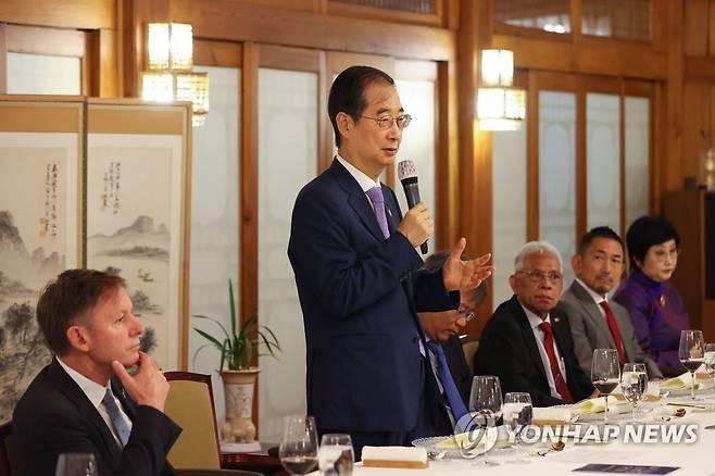 (서울=연합뉴스) 한덕수 국무총리가 23일 서울 종로구 삼청동 총리공관에서 아시아지역 주한 외교단과 만나 대화하고 있다. 2022.9.23 [총리실 제공. 재판매 및 DB 금지]