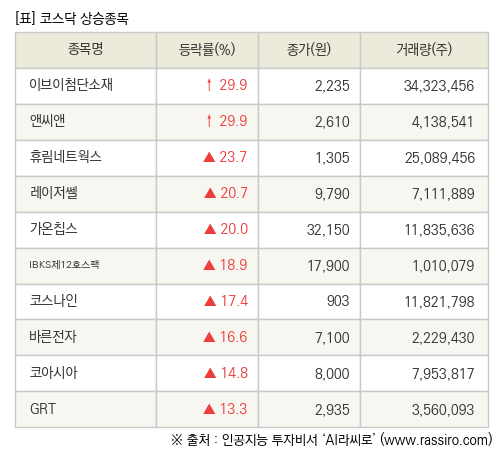[fnRASSI]장마감, 코스닥 상승 종목(이브이첨단소재 29.9% ↑)