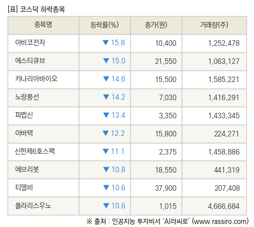 [fnRASSI]장마감, 코스닥 하락 종목(아비코전자 -15.8% ↓)