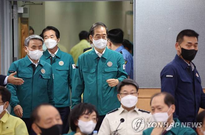 (서울=연합뉴스) 김승두 기자 = 한덕수 국무총리가 23일 정부서울청사에서 열린 을지연습 사후강평회의에 입장하고 있다. 2022.9.23