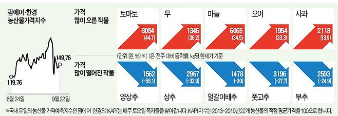 배추도 마찬가지다. 10월 중순 가을배추가 출하를 앞두고 있어 가격이 안정될 것으로 전망된다. 한 대형마트 바이어는 “배추 가격이 강세를 띠면서 재배 농가가 늘었다”며 “가을배추 작황이 나쁘지 않아 김장철에는 평년 수준 가격을 회복할 것”이라고 말했다.