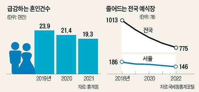 이에 따라 전국의 예식장 수는 계속 감소하고 있다. 전국의 예식장 수는 2018년 1013곳에서 올해 775곳으로 23.5% 줄었다. 서울에서는 매년 10곳이 넘는 매장이 문을 닫고 있다.