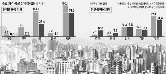 인천(지난해 20.3 대 1→올해 19.8 대 1)과 부산(42.4 대 1→34.4 대 1)도 청약 열기가 식지 않은 지역으로 꼽힌다. 이 두 지역은 분양가 상한제를 적용한 단지 물량이 많았다는 공통점이 있다.