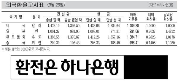 [표] 외국환율고시표 (9월 23일)