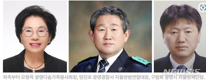 경기 광명시는 '제34회 광명시민대상' 수상자로 오정옥 광명다솜가족봉사회장, 엄진호 광명경찰서 자율방범연합대장, 구필회 광명시 자율방재단장 3명을 선정했다고 23일 밝혔다.