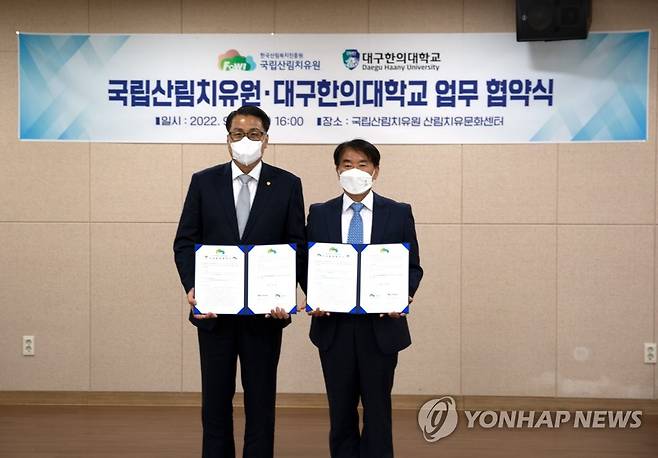 (서울=연합뉴스) 김종연 국립산림치유원장(오른쪽)이 23일 경북 예천군 국립산림치유원에서 변창훈 대구한의대학교 총장과 한의학 기반의 K-치유산업 발전을 위한 업무협약을 체결 후 기념 촬영을 하고 있다. 2022.9.23 [국립산림치유원 제공. 재판매 및 DB 금지]