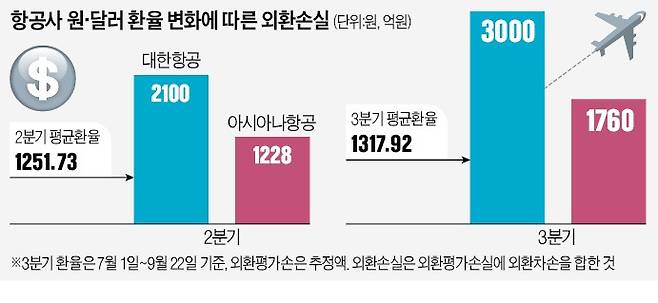 항공기를 들여오느라 달러 빚을 많이 지고 있는 항공업계도 대표적인 고환율 피해 업종이다. 환율이 100원 오르면 대한항공과 아시아나항공 두 항공사에서만 외화평가 손실이 6000억원 넘게 발생한다. 아시아나항공과 저비용항공사(LCC) 등 아시아권 중심으로 취항하는 항공사들은 중국 등과의 왕래가 충분히 풀리지 않은 가운데 금리 상승, 고환율이 ‘엎친 데 덮친’ 처지다.