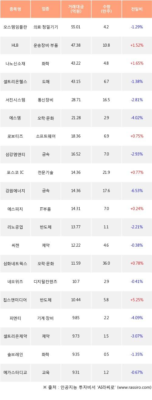 HLB, 나노신소재, 로보티즈 등은 전일 대비 주가가 상승했고, 오스템임플란트, 셀트리온헬스케어, 서진시스템 등은 주가가 하락했다.