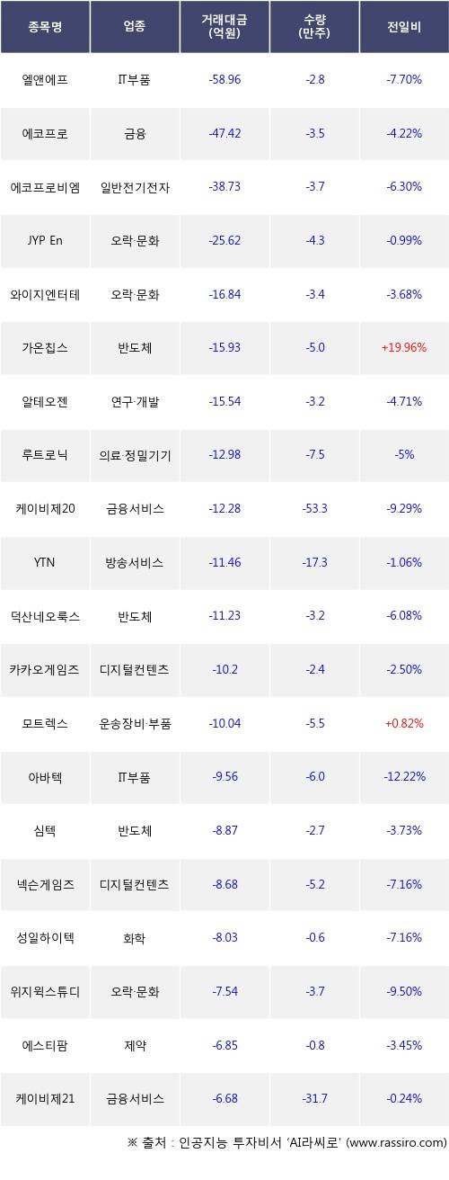 기관 투자자의 순매도 상위 20개 종목은 엘앤에프, 에코프로, 에코프로비엠, JYP Ent., 와이지엔터테인먼트, 가온칩스, 알테오젠, 루트로닉, 케이비제20호스팩, YTN등이다.