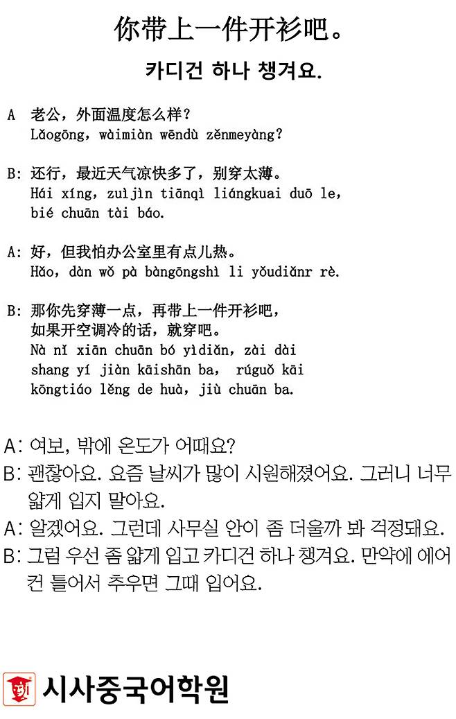 [시사중국어학원의 리얼 중국어 회화] 카디건 하나 챙겨요.