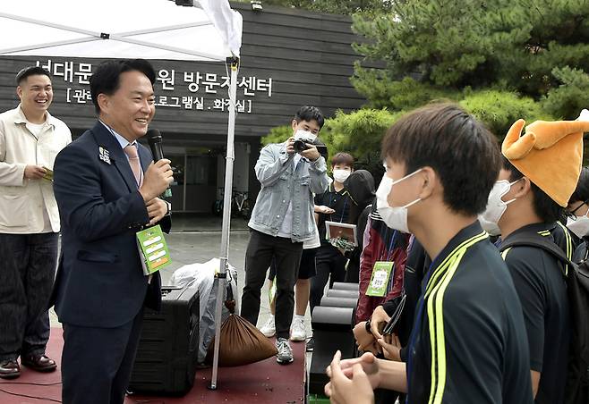 [서울=뉴시스] 고승민 기자 = 이성헌 서대문구청장이 23일 독립공원에서 열린 ‘2022 서대문청소년 진로박람회-꿈BTI’에 참석해 ‘학창 시절의 꿈이 무엇이었는지’에 대한 청소년들의 질문에 답하고 있다. (사진=서대문구 제공) 2022.09.23. photo@newsis.com *재판매 및 DB 금지