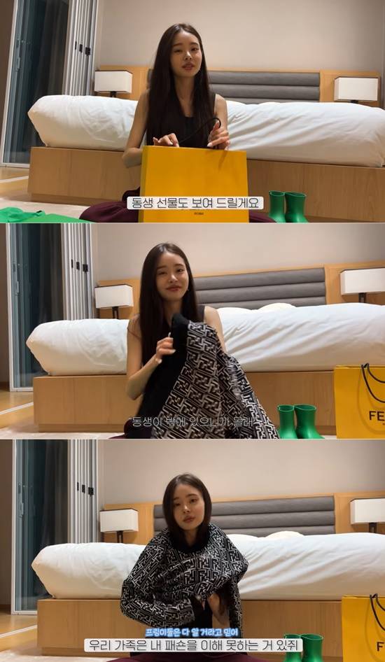 이번 영상에서 프리지아는 동생 생일을 축하하기 위해 준비한 명품 선물을 언박싱해 직접 입어보는 시간을 가졌다.