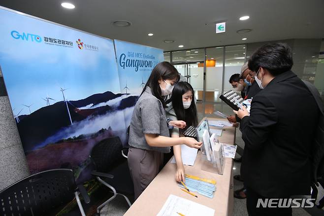 [원주=뉴시스] 김경목 기자 = 23일 오후 강원도관광재단 관계자들이 제18회 강원의료기기전시회(GMES2022)가 열린 강원 원주시 의료기기종합지원센터에서 참가자들을 대상으로 마이스(MICE) 관련 설문조사를 하고 있다. 2022.09.23. photo31@newsis.com