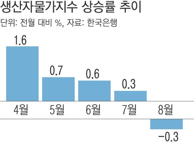한국은행은 8월 생산자물가지수가 7월보다 0.3% 낮은 120.12(2015년 수준 100)를 기록했다고 23일 발표했다. 전월 대비 상승률 기준으로 2020년 10월(-0.4%) 이후 처음으로 내림세를 나타냈다. 생산자물가의 전월 대비 상승률은 올 4월 1.6%로 고점을 찍은 뒤 5월부터 상승폭이 둔화되다 8월 하락전환했다. 다만 전년 동월 대비 증가율은 8.4%로 21개월 연속 상승세를 보였다.