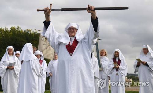 epa10201382 Members of The Druid Order perform a ceremony to celebrate the autumn equinox on Primrose Hill in London, Britain 23 September 2022. The autumnal equinox is when day and night are approximately equal in length and marks the beginning of autumn. EPA/NEIL HALL