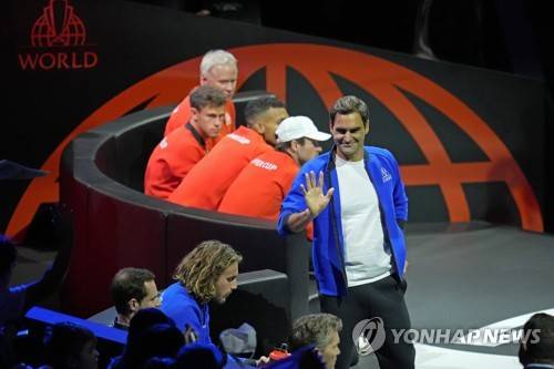 Team Europe's Roger Federer of Switzerland, waves during the match of Team Europe's Casper Ruud against Team World's Jack Sock on day one of the Laver Cup tennis tournament at the O2 in London, Friday, Sept. 23, 2022. (AP Photo/Kin Cheung)