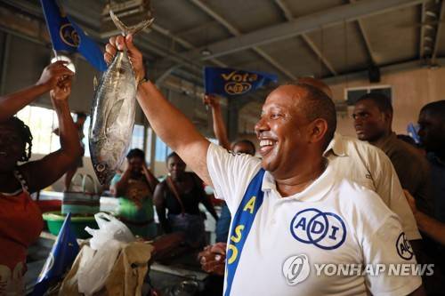 epa10201540 Former prime minister of Sao Tome and Principe Patrice Trovoada, leader of the main opposition party (ADI), during a rally at Bobo Forro market of the electoral campaign for the legislative elections in Sao Tome, 23 September 2022. Sao Tome and Principe goes to the polls for the legislative elections on 25 September 2022. EPA/ESTELA SILVA