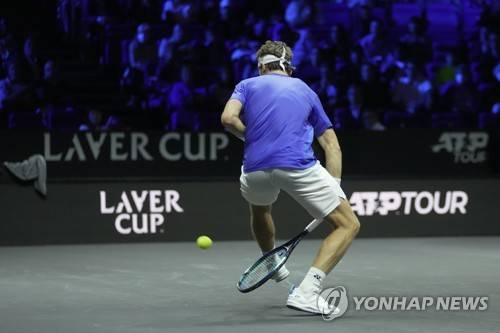 Team Europe's Casper Ruud returns a ball to Team World's Jack Sock during a match on day one of the Laver Cup tennis tournament at the O2 in London, Friday, Sept. 23, 2022. (AP Photo/Kin Cheung)