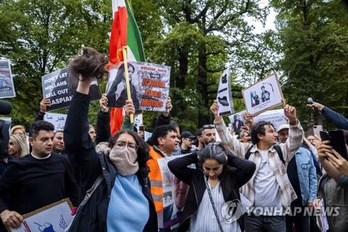 epa10201569 People protest against strict laws in Iran and to support Iranian people following the death of 22-year-old Mahsa Amini, in front of the House of Representatives in The Hague, the Netherlands, 23 September 2022. Amini was arrested in Tehran on 13 September by the morality police, a unit responsible for enforcing Iran's strict dress code for women. She fell into a coma while in police custody and was declared dead on 16 September. EPA/LEX VAN LIESHOUT