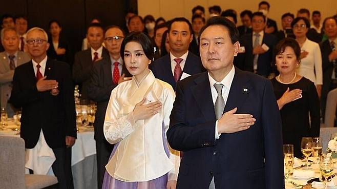 간담회에는 동포 약 200명이 참석했으며 김건희 여사가 뉴욕 때와 마찬가지로 한복 차림을 한 채 동석했습니다.