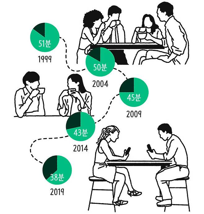 우리나라에서 5년마다 전 국민을 대상으로 하루 24시간을 어떻게 사용했는지 파악하는 조사가 있습니다. 이름하여 생활시간조사. 생활시간조사는 1999년 처음 시작해서 2019년까지 모두 5번의 조사가 이뤄졌어요. 마치 어렸을 때 하루 시간표를 짜는 것처럼 24시간에 대해 언제 잠을 자고, 얼마만큼 일을 하고, 혼자만의 시간을 얼마나 갖는지 세세하게 알아보는 조사입니다. 이 생활시간조사 데이터를 살펴보면 우리나라 사람들이 얼마나 친구들과의 만남에 시간을 투자하는지 알 수 있습니다.