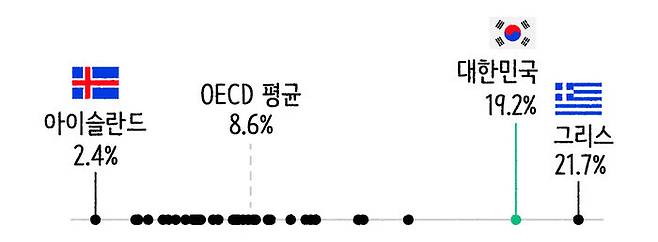손을 내밀 가까운 친구가 없다는 사람이 전체의 20%라는 게 어느 정도 수준인 걸까요? 비교하기 쉽게 OECD 자료를 가져와봤습니다. OECD의 <How's Life> 보고서를 보면 주요 국가별로 삶의 질이 어떤지 통계치를 볼 수 있습니다. 그중 하나인 "곤경에 처했을 때 기댈 가족, 친구가 있나요?"라는 대답에 부정적 비율이 얼마나 되는지 가져와봤어요. 위에서 살펴본 우리나라 사회조사 항목과 비슷하죠? 대한민국의 수치는 19.2%. OECD 국가들 중에 두 번째로 높습니다. 가장 부정적 답변이 많은 국가는 21.7%를 기록한 그리스입니다. 참고로 2015년 보고서에선 우리나라가 27.6%로 1위였는데, 5년 사이에 순위 하나 내려갔고요.