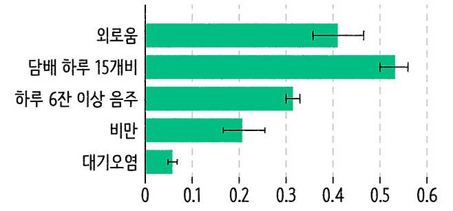 좀 더 외로움의 위험성에 대해 살펴볼게요. 위의 그래프는 외로움이 사망률에 얼마나 영향을 미치는지 여러 다른 조건들과 비교한 자료입니다. 담배를 하루에 15개비 미만으로 피우는 게 사망률 감소에 미치는 영향은 50% 이상입니다. 하루에 6잔 이상의 술을 섭취하는 사람과 금주하는 사람을 비교했을 때 금주가 사망률 감소에 미치는 영향은 30% 정도죠. 그렇다면 외로움은? 외로움이 사망률에 미치는 영향이 술과 담배와 비교했을 때 밀리지 않습니다. 영국과 일본이 국가가 나서서 외로움과 고독을 해결하려는 이유가 여기에 있어요.
