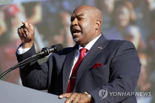Lt. Governor Mark Robinson, Republican from North Carolina, speaks to the crowd at former President Donald Trump's rally Friday, Sept. 23, 2022, in Wilmington, N.C. (AP Photo/Chris Seward)