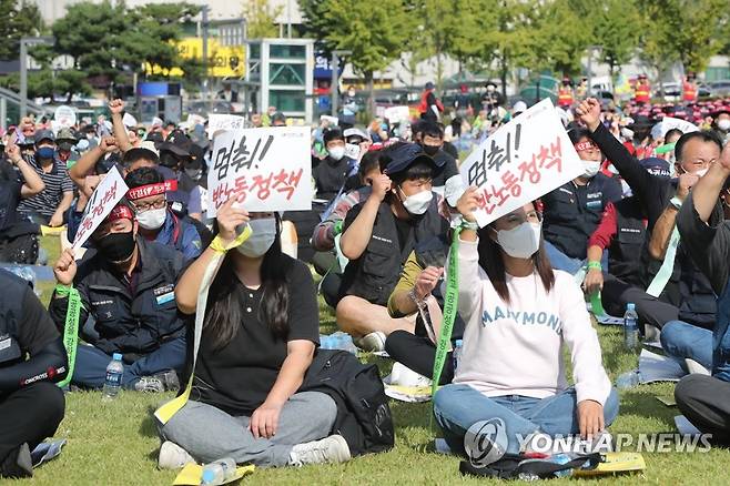 (대전=연합뉴스) 이주형 기자 = 민주노총 대전본부 소속 조합원들이 24일 오후 대전 중구 서대전공원에서 결의대회를 열고 정부의 노동개악 저지와 근로기준법 개정 등을 요구하고 있다.2022.9.24