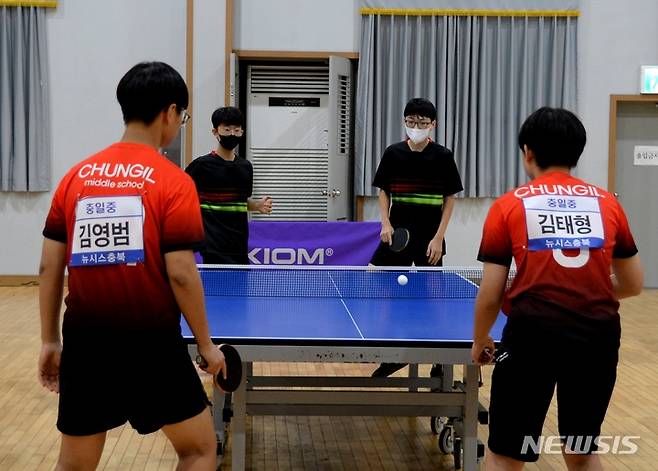 [청주=뉴시스] 조성현 기자 = 24일 오전 충북 청주시 외천꿈돌이 탁구장에서 열린 '28회 충북학교스포츠클럽 대회 겸 9회 뉴시스배 탁구대회'에 참가한 선수들이 열띤 경쟁을 벌이고 있다. 2022.09.24. jsh0128@newsis.com