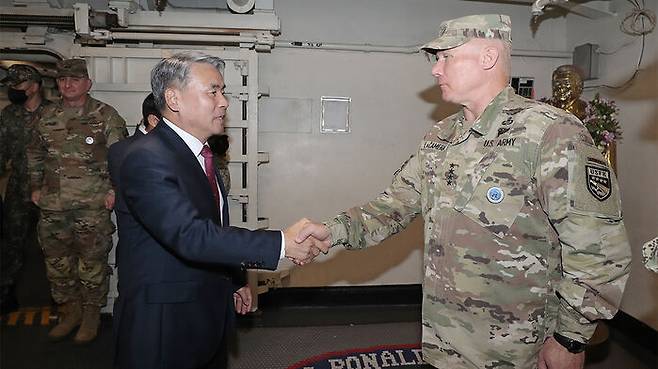 이종섭 국방부 장관이 폴 J.러캐머라 한미연합사령관과 함께 부산작전기지에 입항한 미국의 핵 추진 항공모함 로널드 레이건함(CVN-76)을 찾아 항모 운용에 대해 보고받고 굳건한 한미 연합작전태세 유지를 당부했습니다.