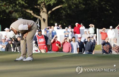 epa10203505 International Team member Sungjae Im of South Korea reacts to his putt on the fifth hole during foursomes matches of the 2022 Presidents Cup golf tournament, at the Quail Hollow Club, in Charlotte, North Carolina, USA, 24 September 2022. EPA/ERIK S. LESSER