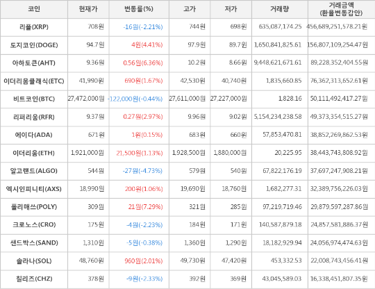 가상화폐 시세 (제공: 암호화폐 거래소 업비트)현재 암호화폐 거래소 "업비트"에 따르면 가상화폐 대장 격인 비트코인의 시세는 전일 대비 -122,000원(-0.44%) 하락한 27,472,000원에 거래되고 있다.